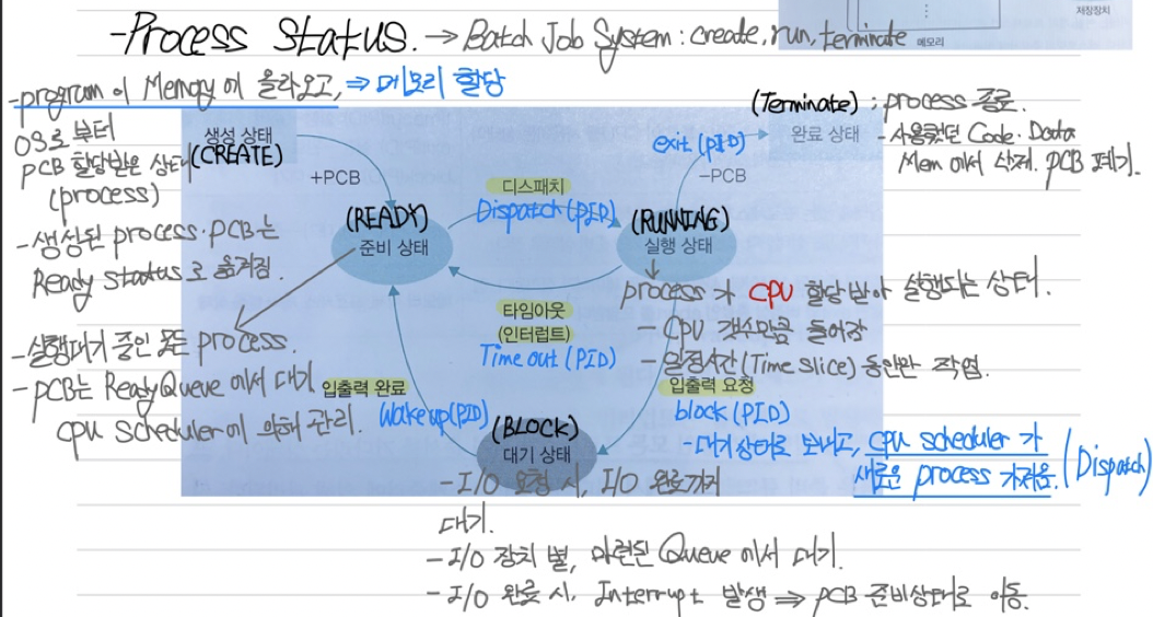 - 처리 끝나면 CPU는 기존에 하던 일을 마저 하러간다(아까 실행하던 프로세스의 PCB에 저장되어 있는 부분부터 다시 실행 시작)